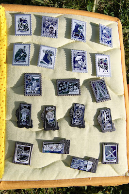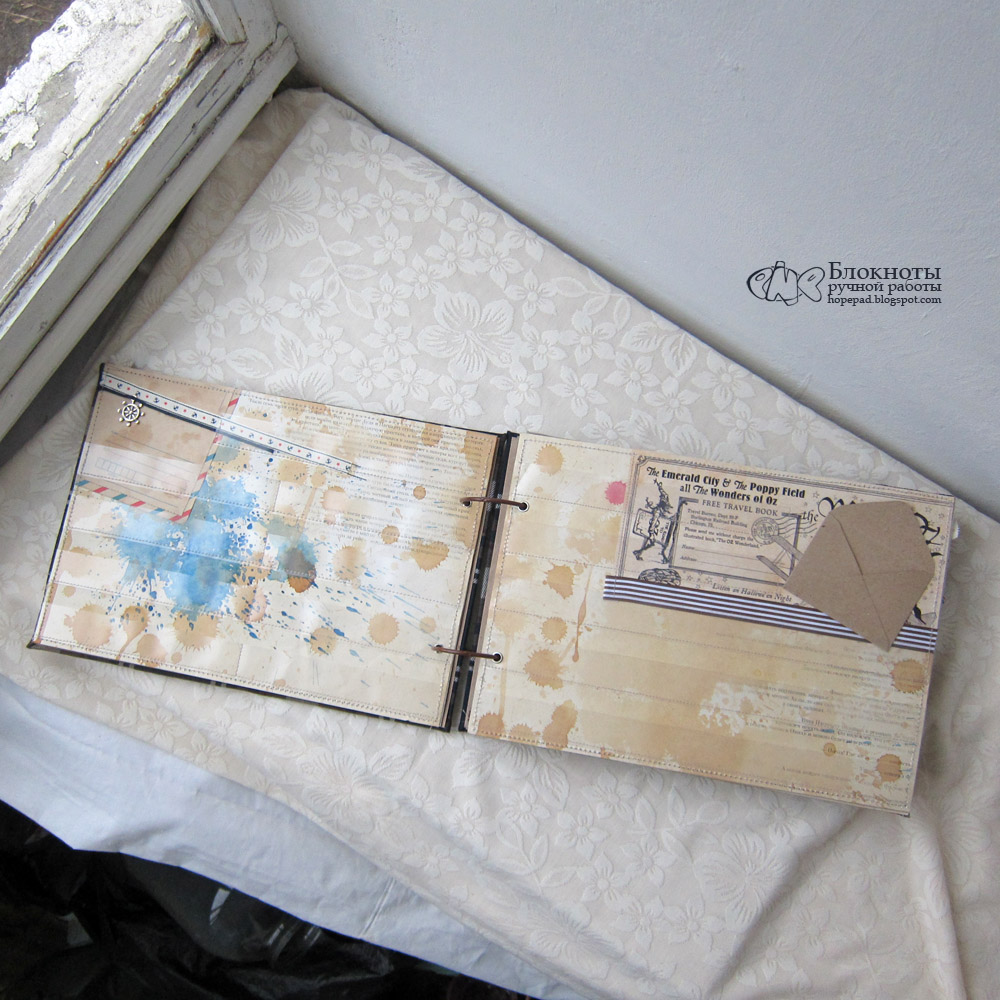 Основа — тонированная бумага для черчения с акварельными кляксами. Для марок — прозрачные кармашки из пристроченной пленки, каждая страница немного декорирована.